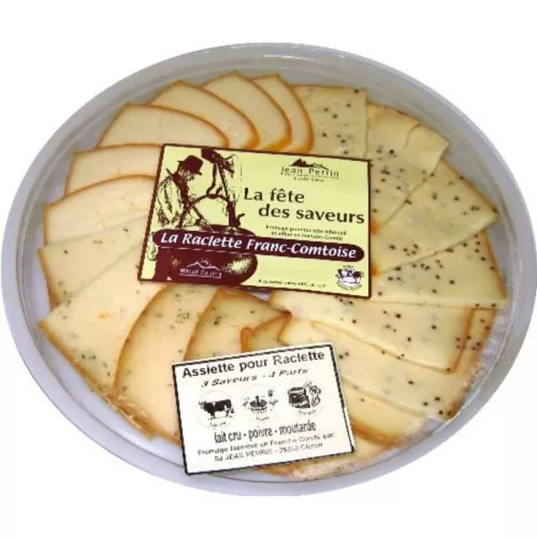 Ingreftnts : fromage pour raclette poivre (LAIT de tache pasteurisé, grains de poivre 0,3%, sel, ferments lactiques, enzyme coagulante), fromage pour raclette au lait cru (LAIT cru de vache, sel, ferments lactiques, enzyme coagulante), fromage pour raclette moutarde (LAIT de ËChe pasteurisé, graines de MOUTARDE 1,5%, sel, ferments lactiques, enzyme coagulante). Lait origine France