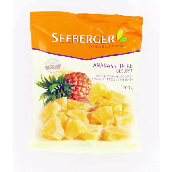查看品牌Seeberger的所有产品菠萝 54%,糖,酸化剂:柠檬酸,抗氧化剂:二氧化硫。