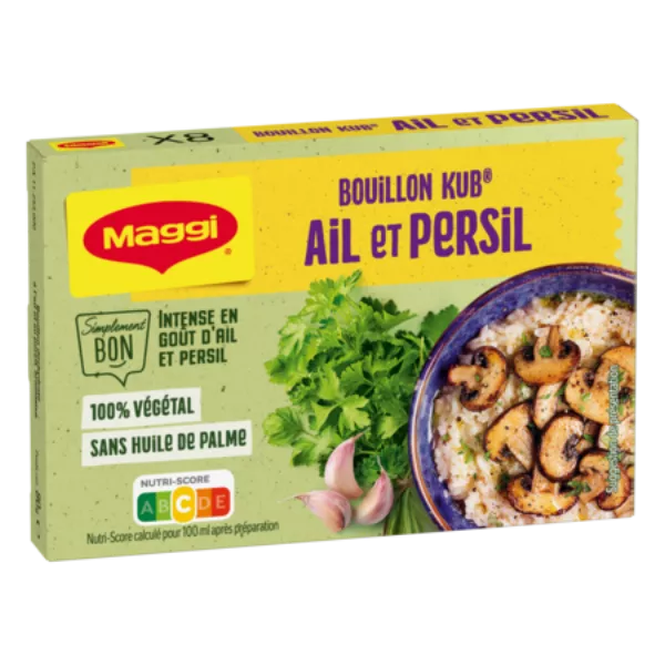 查看品牌Maggi的所有产品Sel iodé, fécule de pomme de terre, sucre, beurre de karité, ail 6,7%, arômes, extrait de levure, persil 2%, sel, huile de tournesol, poireau, oignon, curcuma, poivre blanc. Peut contenir: CÉLERI, ŒUFS, POISSONS, GLUTEN, LAIT, SOJA.