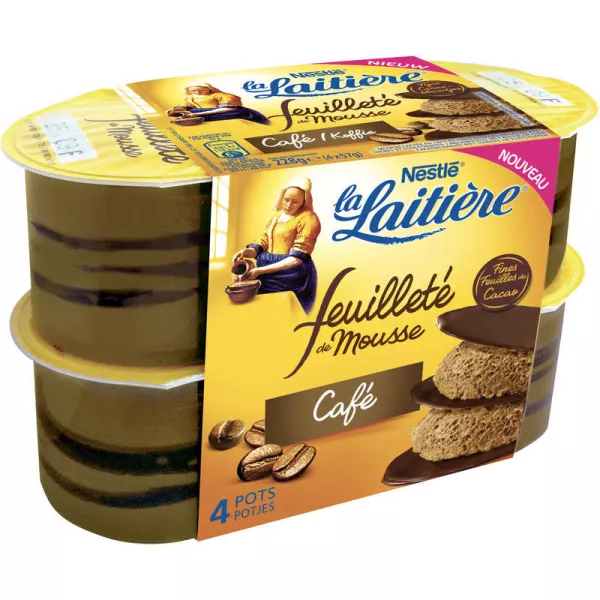 _Lait_ entier (63,3%), crème (_lait_), sucre, beurre de cacao, pâte de cacao, _lait_ écrémé en poudre, extrait de café (1,5%), gélatine bovine, arômes, émulsifiant (E472b), épaississants (alginate de sodium), édulcorants (sucralose, acésulfame K), correcteur d'acidité (hydroxyde de sodium).