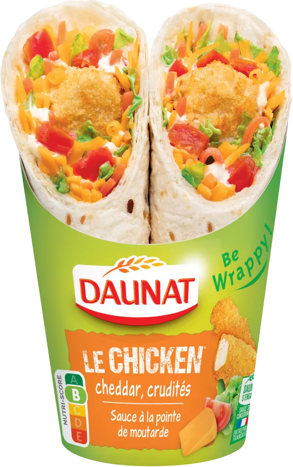 Galette de blé aux graines de lin 48% (farine de blé 29,5%, eau, huile de colza, graines de lin 1,1%, sel, poudre à lever: carbonates de sodium), viande de poulet saumurée reconstituée enrobée frite et cuite 21% (viande de poulet origine France, farine de blé, huile de tournesol, eau, sel, levure, sucre, gluten de blé, blanc d'oeuf, amidon transformé de blé), mayonnaise allégée en matières grasses moutardée 11% [huile de colza, eau, moutarde 1% (eau, graines de moutarde, vinaigre d'alcool, sel), jaune d'œuf, amidon, vinaigre d'alcool, sucre, sell, crudités 9% (salade 5,3%, tomate 3,7%), carotte râpée en saumure vinaigrée [carotte, eau, vinaigres (vinaigre d'alcool et vinaigre de vin blanc), sel, sucre, acidifiant: acide lactique, antioxydant: acide citrique], cheddar fondu 3% (cheddar, fromages, eau, amidons transformés, protéines de lait, lait écrémé en poudre, beurre, sel de fonte: citrates de sodium, gélifiant: carraghénanes, colorant: bixine de rocou), amidon transformé de pomme de terre. (% exprimés sur le produit fini), Informations en gras destinées aux personnes allergiques Traces eventuelles de poissons, crustacés, céleri, graines de sésame, soja, lupin et fruits à coque. Dannat Service Consommateurs