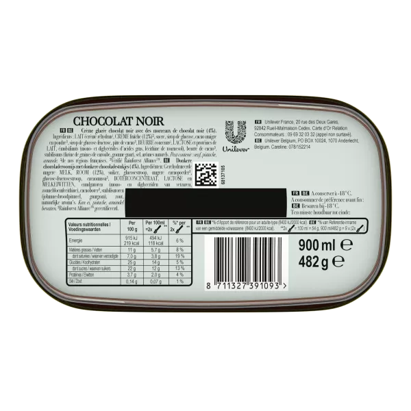 حليب منزوع الدسم مُجدد (46٪) ، كريم طازج 1 (12٪) ، سكر ، شراب جلوكوز ، مسحوق كاكاو قليل الدهن² ، شراب جلوكوز-فركتوز ، كتلة كاكاو² ، زبدة مركزة ، لاكتوز وبروتينات حليب ، مستحلبات (أحادية وثنائية الجلسريدات من الأحماض الدهنية ، ليسيثين عباد الشمس) ، زبدة الكاكاو² ، مثبتات (دقيق حبوب الجراد ، صمغ الغوار) ، ملح ، نكهات طبيعية. قد تحتوي على: بيض ، فستق ، لوز. 1 من مناطقنا الفرنسية. تم التحقق من ²Rainforest Alliance ™.