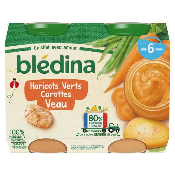 وعاء أطفال من 6 أشهر فاصوليا خضراء جزر لحم عجل 2x200 جرام - BLEDINA تاجر الجملة