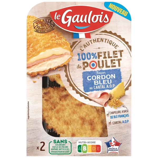 لحم الدجاج المملح: 52٪ (لحم دجاج من فرنسا: 40٪ ، ماء ، ألياف قمح ، دكستروز القمح ، بروتين القمح ، ملح) ، فتات الخبز: 23٪ (دقيق قمح ، خميرة ، ملح) ، كانتال مذابة: 15٪ (كانتال AOP : 10.5٪ ، نشويات معدلة ، زبدة ، ماء ، ملح) ، لحم ديك رومي مطبوخ: 10٪ (لحم ديك رومي من فرنسا: 7٪ ، ماء ، ألياف قمح ، دكستروز ، ملح ، عامل التبلور: كاراجينان ، مضادات الأكسدة: أسكوربات الصوديوم ، نكهة طبيعية ، السلق ، الجزر ، الخميرة). زيت عباد الشمس.