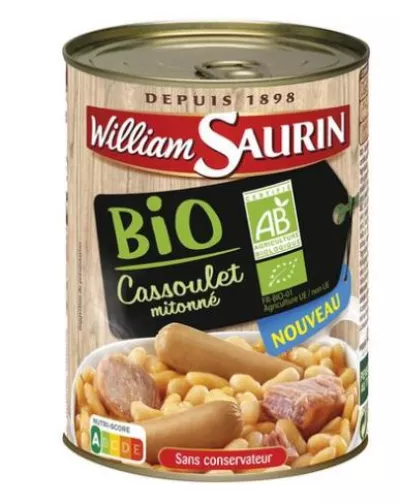 Eau, haricots blancs réhydratés précuits* 33%, saucisses fumées et saucisson (viande* et gras* de porc, eau, couenne de porc*, farine de BLÉ*, sel, protéines de SOJA*), épaule de porc préparée en salaison (épaule de porc*, eau, sel), double concentré de tomate*, huile de colza*, farine de BLÉ*, sel, arômes naturels, sucre de canne*. *Ingrédients issus de l'Agriculture Biologique. Total charcuterie et viande mise en œuvre 22%. Viandes d'origine Union Européenne. Information allergènes: contient céréales à gluten (blé), soja.