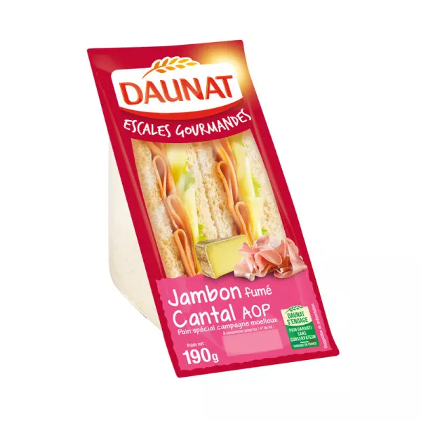 SPECIALE PANE A FETTE CAMPAGNA (44,7%): Farina di frumento, acqua, farina di segale, lievito madre di segale e farina di frumento maltato, olio di colza, glutine, sale, lievito, aceto, farina di fave, malto d'orzo, farina di frumento maltato, estratto di acerola. CONTORNO: Prosciutto Cotto affumicato scelta 23,7%: prosciutto di suino provenienza UE, acqua, sale, destrosio, sciroppo di glucosio, aromi, stabilizzanti: E451-E450, antiossidante: eritorbato sodico, conservante: E250. Cantal A.O.P affinato in Francia 13,2% (latte proveniente dalla Francia): latte vaccino pastorizzato, sale, caglio animale, fermenti lattici. Maionese alla senape 10,5%: olio di colza, senape di Digione 1% (acqua, semi di senape, aceto, sale, acidificante E330, antiossidante: disolfito di potassio), acqua, tuorlo d'uovo, aceto, sale, zucchero, addensanti: gomme di guar e xantano, trasformate fecola di patate. Insalata.