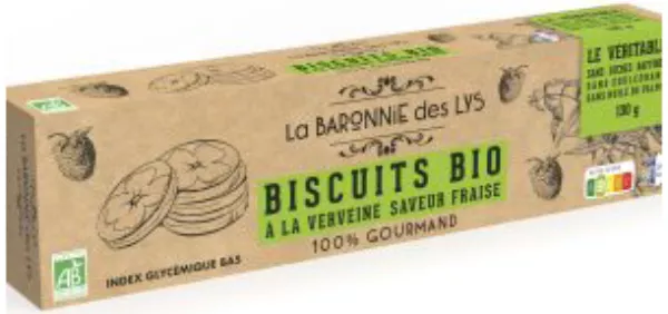 Farina di frumento*; sciroppo di agave*; Olio di Colza*; Burro*; verbena* 1%; uova intere in polvere*; Latte scremato in polvere*; lieviti in polvere: carbonati di ammonio, aroma naturale di fragola* 0,75%; sale marino