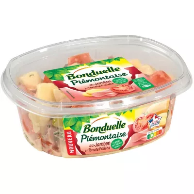 Patate pastorizzate (46%), pomodori (17%), prosciutto cotto superiore (11%) (prosciutto di suino (10%), sale, brodo (ossa e carne di suino), aromi salati (contengono naturalmente polifenoli), antiossidante: ascorbico acido), olio di cobza, uova sode (5,5%), acqua, aceto di spirito, sottaceti a fette sott'aceto (1%) (sottaceti, acqua, aceto di spirito, sale, cloruro di calcio), senape di Digione (acqua, senape semi, aceto di alcool, sale), sale, prezzemolo a foglia piatta, tuorlo d'uovo pastorizzato in polvere, addensanti: gomma di xantano - gomma di guar, aroma naturale di pepe.