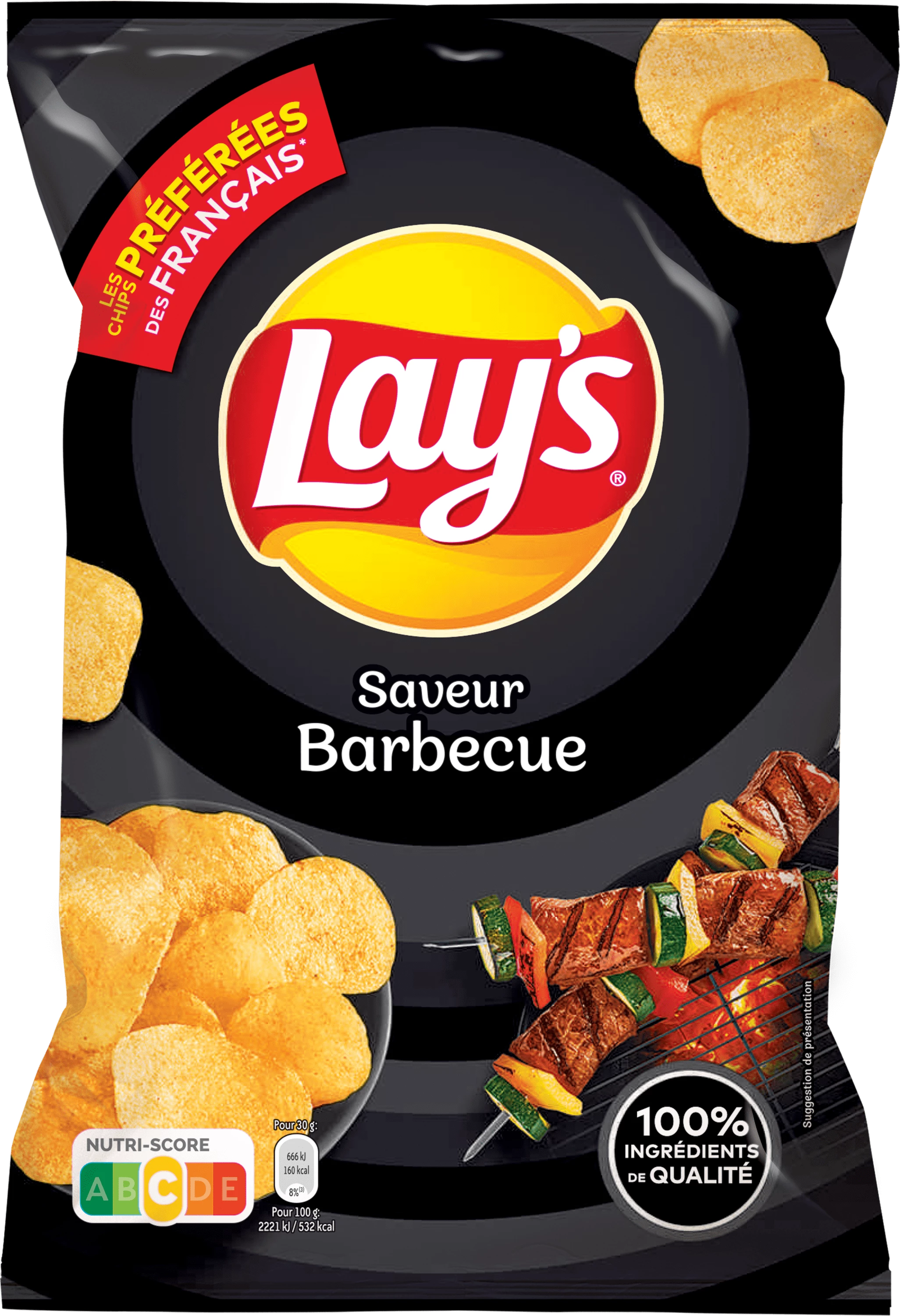 Patate (62%), oli vegetali (girasole, colza, mais in proporzione variabile), base aroma barbecue [zucchero, sale, maltodestrine, aromi (inclusa soia), destrosio, paprika, cipolla in polvere, pomodoro in polvere, aglio in polvere, regolatori di acidità (acido malico, acido citrico), colore (estratto di paprika), aroma di affumicatura].