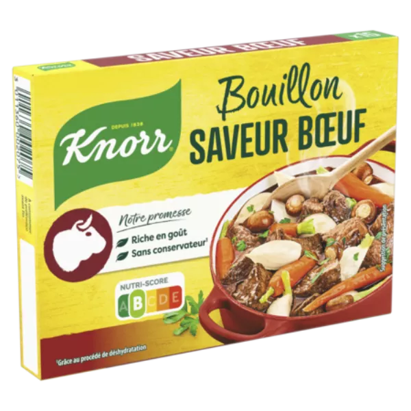 Sel, graisses végétales (palme, palme totalement hydrogénée), amidon, chlorure de potassium, sucre, arômes, exhausteurs de goût : glutamate de sodium, inosinate disodique et guanylate disodique, graisse de bœuf : 3%, fond de bœuf concentré (préparé à partir d'os de bœuf) : 1%, sirop de caramel, maltodextrine, persil² : 0,4%, antioxydant : extraits de romarin. ²Ingrédient issu de l'agriculture durable. Ce bouillon contient de la graisse de bœuf et du fond de bœuf concentré.