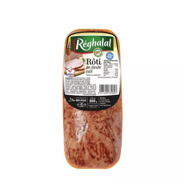 Roast turkey Halal cooked, cured. Ingredients (at the implementation): Halal turkey meat with skin (origin France) 68%, water, salt, potato starch, corn dextrose, glucose syrup, pea and bamboo fibers, soy proteins , acidifiers: potassium lactate, trisodium citrate, sodium carbonate, aroma, gelling agents: carrageenans, antioxidant: sodium erythorbate, preservative: sodium nitrite, colorants: E150a, paprika extract.