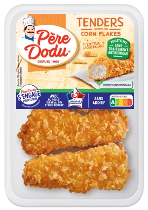 Chicken meat 55%, wheat flour, corn flakes 8%, aroma, wheat fiber and gluten, potato starch and dextrin, salt, spices, yeast, onion and garlic powder. Sunflower oil. Possible traces of egg, milk and other cereals containing gluten.
