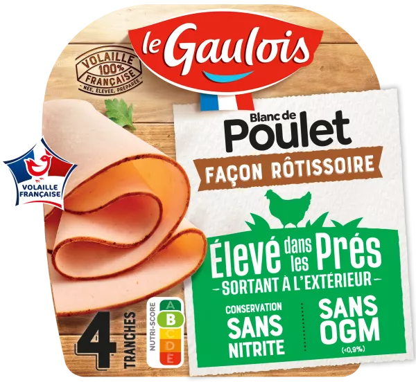 Chicken fillet meat from France: 90%, water, preservative: potassium lactate, salt, wheat dextrose, natural flavor, gelling agent: carrageenans, antioxidant: ascorbic acid, sugar.