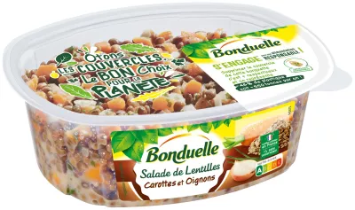 Lentils 65% (dried soaked lentils (BLE), water, salt), carrots 12%, water, rapeseed oil, alcohol vinegar, dehydrated onions 1%, Dijon MUSTARD (water, MUSTARD seeds, alcohol vinegar , salt), parsley 1%, natural flavors (GLUTEN), thickeners: xanthan gum - guar gum. Manufactured in a workshop that also uses: celery, milk, egg, fish, crustacean, mollusc, soya and nuts.