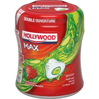 Chicle sin Azúcar HOLLYWOOD con Edulcorantes-Sabor Fresa y Lima ww.wents: Edulcorantes (Maltitols, Sorbitols, Aspartame, Acesulfame K), Mectant Pale Gum(422), Gelatina, Aromas, Acidulantes (Ácido Málico, Ácido Dítrico Emulsionante Hune ( Lecitina de girasol) Colorantes (E171, E141, E160a, ET0 recubrimiento (E903), Espesante (E466). Un consumo excesivo puede tener efectos laxantes. Contiene una fuente de fenilalanina Información nutricional/100g:Energía 778KJ/