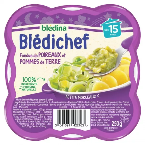 PROVEEDOR EN Plato bebé a partir de 15 meses Fondue de puerros y patatas Blédichef Bandeja 250g - BLÉDINA AL POR MAYOR