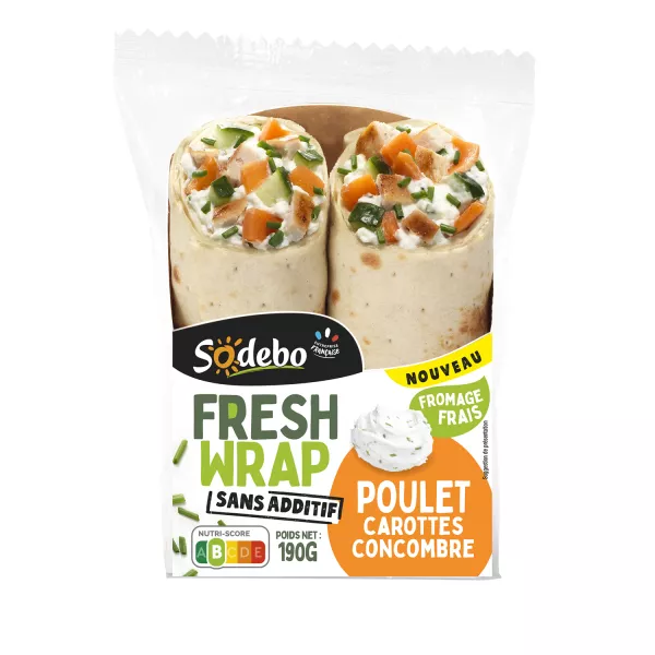 Tortita de trigo (24% harina de trigo, agua, aceite de colza, fibras vegetales, dextrosa de trigo, sal), carne de pollo, queso crema, zanahorias, queso natural, pepino, cebollas asadas al agua, aceites vegetales (colza, girasol), vinagre de alcohol, harina de trigo, almidón de maíz, almidón de mandioca, dextrosa de trigo, sal, sabor natural, cebollín.
