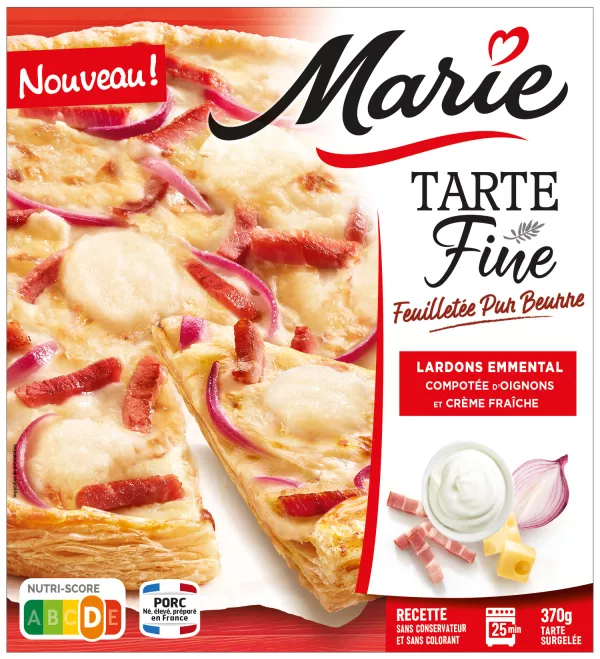 Guarnición 54,1 % tocino ahumado cocido 10,8 % (panceta de cerdo de Francia, sal, aromas naturales*, antioxidante: ácido ascórbico), queso blanco, emmental 6,7 %, compota de cebolla 6,7 ​​% (cebolla 3,9 %, agua, nata fresca, mantequilla, maíz fécula, miel, sal ahumada, cúrcuma), cebolla roja 5,4%, nata fresca 4,4%, agua, cebolla prefrita 2,2% (cebolla, aceite de girasol), cebolla 1,7%, fécula de maíz, cebolla frita deshidratada 0,5% (cebolla , aceite de girasol oleico, aceite de girasol), sal, nuez moscada, pimienta.*Polifenoles naturales que contribuyen a la conservación de la oxidación. Hojaldre 45,9% harina de trigo 23,3%, agua, mantequilla 10,3%, sal, levadura desactivada. Emmental y nata fresca: origen UE. Cebollas: origen comunitario y extracomunitario. Información en negrita para alérgicos. Posibles trazas de: pescado, crustáceos, moluscos, huevo, apio, mostaza.