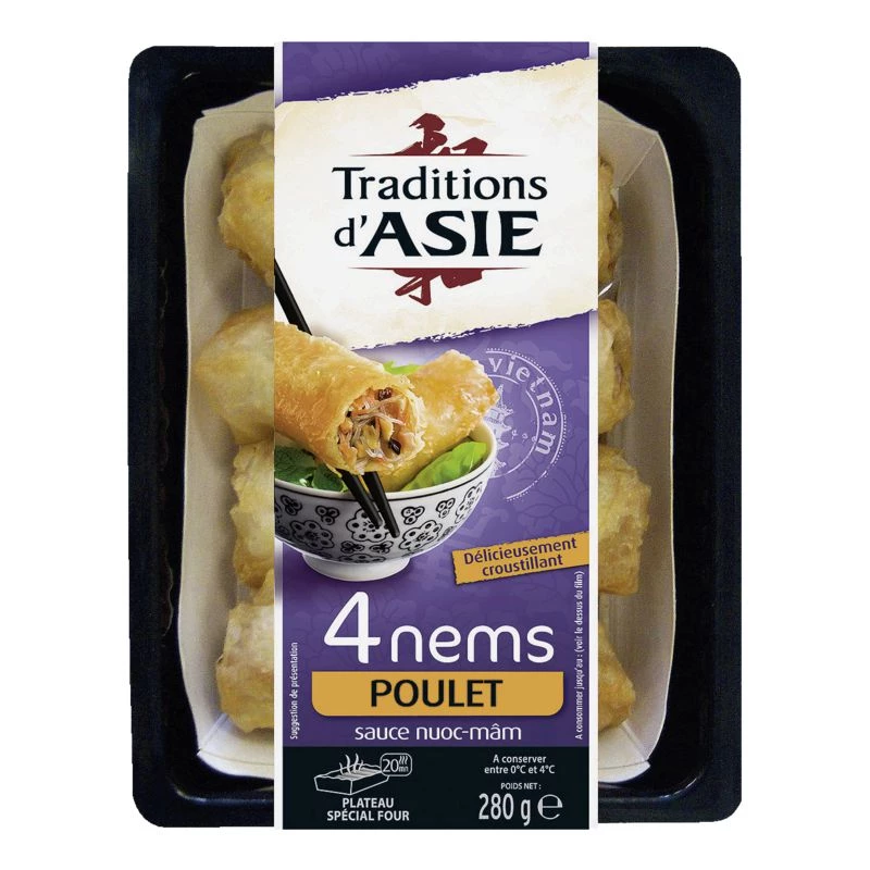Nems poulet 4 x 60 g : Galette de riz 38% (eau, farine de riz, sel), vermicelle réhydraté (eau, amidon de pois), viande de poulet origine France 11,4%, carottes, peau de poulet rôtie et gras 6,8% (peau de poulet, miel), oignons préfrits (dont huile de tournesol), huile de tournesol, oignons, farine de soja, champignons noirs réhydratés, sauce poisson (poisson, sel, eau), sel. (pourcentages exprimés sur le nem) Sauce nuoc-mâm 40 g : eau, sucre, vinaigre d'alcool, sel, nuoc-mâm 1,6% (poisson, sel, eau), sauce soja (eau, graines de soja, sel, farine de blé) (pourcentage exprimé sur la sauce)
