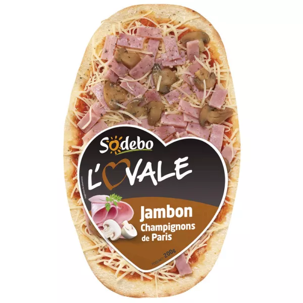 Garniture 58%: sauce tomate à huile d’olive (purée de tomate, eau, farine de blé, sel, huile d’olive, amidon de maïs), jambon cuit standard 23% (jambon de porc, eau, sel, sirop de glucose, dextrose, stabilisant: E451, gélifiant: E407, lactose, arôme naturel, bouillon de porc, antioxydant: E316, conservateur: E250, ferments), champignons de Paris 19%, emmental, basilic et origan.Pourcentages exprimés sur la garniture. Pâte 42% : farine de blé, eau, levure boulangère, sel.