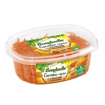 Carottes (79%), eau, huile de colza, MOUTARDE à l'ancienne (2%) (eau, vinaigre d'alcool, graines de MOUTARDE, téguments, sel, acidifiant : acide citrique, arômes naturels, épices), vinaigre d'alcool, purée d'ail, sel, arômes naturels (CELERI), MOUTARDE de Dijon (eau, graines de MOUTARDE, vinaigre d'alcool, sel), amidon transformé de pomme de terre, antioxygène : acide ascorbique, épaississants : gomme xanthane - gomme guar. Fabriqué dans un atelier utilisant également : gluten, lait, crustacé, oeuf, poisson, mollusque, soja, fruits à coque.