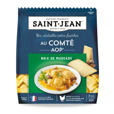 Pâte 50 % : Semoule de blé dur de qualité supérieure 36%, eau, œufs frais issus de poules élevées en plein air 5% (140g par kg de semoule). Farce 50% : Comté AOP 16%, ricotta, fromage frais, flocon de pomme de terre (pommes de terre déshydratées, extrait d'épices), chapelure (blé), sel, fibre de blé, muscade, poivre.