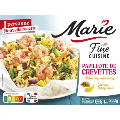 Riz cuit 33% (eau, riz, riz rouge), crevettes décortiquées 16,8% (crevettes, eau, sel), jus au curry coco 15,6% [lait de coco 5,3%, crème fraiche, huile de colza, eau, purée de gingembre, coriandre, huile d'olive vierge, sel, amidon de riz, curry 0,16 (Curcuma, coriandre, graine de moutarde, fenugrec, cumin, piment fort), curcuma), carottes jaunes 8,7%, courgettes grillées 8,5%,oignons rouges 6,5%, carottes 4,6%, brocolis 26%, huile de colza, sel.