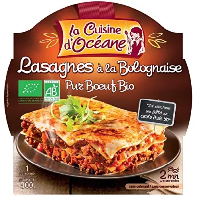Sauce béchamel* 21 % (eau, _lait_ écrémé en poudre*, épaississant : farine de caroube, sel, épices et aromates*, huile de colza*), eau, tomates pelées* 14 %, viande de bœuf* 13 %, pâtes* 12 % (semoule de _blé_ dur*, _œufs_ frais*, eau), concentré de tomates* 6 %, _crème_ fraîche*, oignons*, carottes*, huile d'olive vierge extra*, _emmental_* 1,6%, vinaigre d'alcool*, ail déshydraté*, sel, sucre*, basilic*, origan*, persil* *Ingrédients issus de l'agriculture biologique.