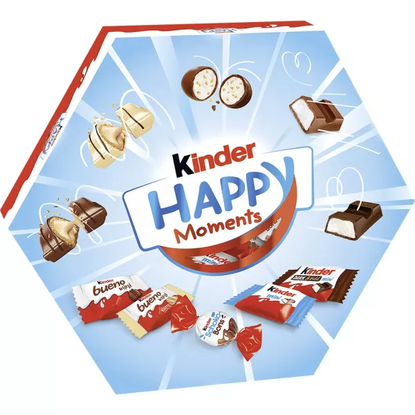 Dunkle Schokolade 40 % (Zucker, Kakaomasse, Kakaobutter, VOLLMILCHPULVER, Emulgator Lecithine (SOJA), Vanillin), Zucker, MAGERMILCHPULVER (18 %), Palmöl, BUTTERREINFETT, Emulgator Lecithine (SOJA), Vanillin. Gesamtmilchbestandteile im Produkt 25,5 %. Gesamtkakaobestandteile im Produkt 18,5%. KINDER CHOCOLATE MINI DARK-MILD - Chocolat noir avec fourrage lait. Ingrédients: chocolat noir 40% (sucre, pâte de cacao, beurre de cacao, LAIT en poudre, émulsifiants (lécithines [SOJA]), vanilline), sucre, LAIT écrémé en poudre 18%, huile de palme, BEURRE concentré, émulsifiants (lécithines [SOJA)), vanilline. Sur le total: produits laitiers 25,5%; cacao 18,5%. KINDER CHOCOLATE MINI DARK-MILD - Pure chocolade met melkvulling. Ingrediënten: pure chocolade 40% (suiker, cacaomassa, cacaoboter, MELKPOEDER, emulgatoren (lecithinen [SOJA)), vanilline), suiker, magere MELKPOEDER 18%, palmolie, BOTERCONCENTRAAT, emulgatoren (lecithinen [SOJA]), vanilline. Op het totaal: melkproducten 25,5%; cacao 18,5%. BE D BE KINDER BUENO MINI je 5,4 g - Waffel mit feiner Milchhaselnusscreme-Füllung (54 %), überzogen mit Milchschokolade. Zutaten: MILCHSCHOKOLADE 31 % (Zucker, Kakaobutter, Kakaomasse, MAGERMILCHPULVER, BUTTERREINFETT, Emulgator ecithine (SOJA), Vanillin), Zucker, Palmöl, WEIZENMEHL, HASELNÜSSE (10,8%), MAGERMILCHPULVER (8,5 %), VOLLMILCHPULVER (5,5 %), Halbbitterschokolade 2 % (Zucker, Kakaomasse, Kakaobutter, Emulgator Lecithine (SOJA), Vanillin), fettarmer Kakao, ulgator Lecithine (SOJA), Backtriebmittel Natriumhydrogencarbonat, Salz, Vanillin. Gesamtmilchbestandteile im Produkt 19 %. Fines gaufrettes enrobées de chocolat au lait, fourrées lait et noisettes. Ingrédients: chocolat au LAIT 31% (sucre, beurre de cacao, pâte acao, LAIT écrémé en poudre, BEURRE concentré, émulsifiants: lécithines [SOJA]; vanilline), sucre, huile de palme, farine de FROMENT, NOISETTES 10,8%, LAIT écrémé en poudre 8,5%, LAIT en poudre 5,5%, chocolat noir (sucre, pâte de cacao, beurre de cacao fiants: lécithines [SOJA]; vanilline), cacao maigre, émulsifiants: lécithines [SOJA]; poudres à lever (carbonate acide de sodium), sel, vanilline. Sur le total: produits laitiers 19%. Fijne wafeltjes met melk en gemalen hazelnootvulling, omhuld met melkchocola nten: MELKCHOCOLADE 31% (suiker, cacaoboter, cacaomassa, magere MELKPOEDER, BOTERCONCENTRAAT, emulgatoren: lecithinen [SOJA), vanilline), suiker, palmolie, TARWEMEEL, HAZELNOTEN 10,8%, magere MELKPOEDER 8,5%, MELKPOEDER 5,5%, (suiker, cacaomassa, cacaoboter, emulgatoren: lecithinen [SOJA), vanilline), magere cacao, emulgatoren: lecithinen [SOJA], rijsmiddelen (natriumwaterstofcarbonaat), zout, vanilline. Op het totaal: melkproducten 19%. A KINDER BUENO WHITE MINI je 5,4 g-Waffel mit feiner Milchhaselnusscreme-Füllung (54 %), überzogen mit Weißer Schokolade. Zutaten: Weiße Schokolade 29,5 % (Kakaobutter, Zucker, MAGERMILCHPULVER, BUTTERREINFETT, Emulgator Lecithine (SOJA), Vanillin), Zuc ENMEHL, HASELNÜSSE (10,8 %), MAGERMILCHPULVER (8,5 %), VOLLMILCHPULVER (5,5%), MILCHSCHOKOLADE 3,5 % (Zucker, Kakaobutter, Kakaomasse, MAGERMILCHPULVER, BUTTERREINFETT, Emulgator Lecithine (SOJA), Vanillin), fettarmer Kakad hine (SOJA), Backtriebmittel Natriumhydrogencarbonat, Salz, Vanillin. Gesamtmilchbestandteile im Produkt 23 %.
