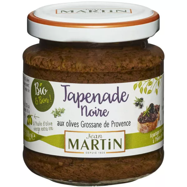 Olives noires 82%, câpres 6 %, huile d'olive, crème d'anchois (anchois salés 82%, huile d'olive, vinaigre de vin, sel, épices), ail, poivre