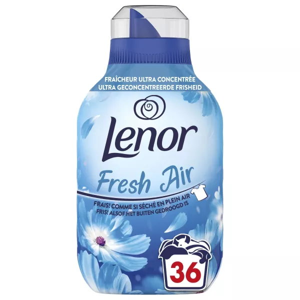 Zawartość produktu : Profitez d'une sensation de fraîcheur comme si vos vêtements avaient séché à l'extérieur, même lorsqu'ils ont séché à l'intérieur. La formule fraîche ultra concentrée de Lenor Fresh Air est plus concentrée que les autres adoucissants Lenor, pour vous offrir 36 lavages dans une petite bouteille.