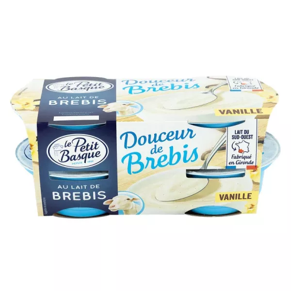 Schafsmilch (Herkunft: Frankreich), Schafsahne (Herkunft: Frankreich), Wasser, Zucker 6,4 %, Maisstärke, Reisstärke, Zitronensaft, natürliches Vanillearoma, Milchfermente (einschließlich Milch), Dekor: Vanillerinde.