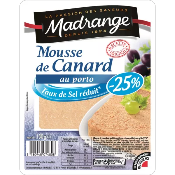Schweinefett*, magere Entenleber 17 %, Hühnerleber, Entenfett 12 %, Schweineschwarte*, MagerMILCH, Schmalz, Sahne (MILCH), Wasser, WEIZENMEHL, Zucker, Porto 0,8 %, Salz, Maisstärke, natürliche Aromen , Pfeffer, Antioxidationsmittel: Natriumerythorbat, Farbstoffe: Lutein- und Paprikaextrakt, Konservierungsstoff: Natriumnitrit. * Französisches Schweinefleisch, das ab dem Ende der Entwöhnung (42. Tag) ohne Antibiotika aufgezogen wurde. ** im Vergleich zum Marktdurchschnitt für ähnliche Produkte. Ente und Huhn Herkunft EU. Porto aus Portugal.