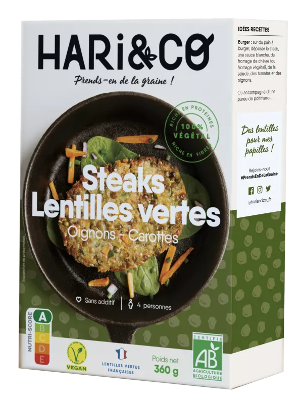 Lentilles vertes (50 %) , semoule de maïs, semoule de blé, flocons de blé, carottes (5 % ), huile de tournesol", chou - fleur*, farine de blé", oignons (3 %), sel marin, ail, herbes de Provence, menthe', cumin*, poivre.