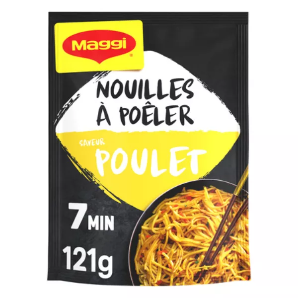 Nouilles 82% (semoule de BLÉ, OEUF), sel iodé (sel, iodate de potassium), oignon, carottes 1.5%, épices 1.4% (ail, curcuma, gingembre, coriandre, piment, cumin, fenugrec, cardamome, livèche, poivre blanc, carvi, piment de Cayenne), sucre, chou, morceaux déshydratés à base de viande de volaille 0.8% (viande de poule 0.5%, farine de BLE, graisse de poulet, oignon, sel iodé, blanc d'OEUF, levure, curcuma, antioxydant : extraits de romarin), extrait de levure, graisse de poulet, sel, poireau, poivron rouge, colorant (caramel ordinaire), arômes, extrait végétal aminé (BLE), correcteur d'acidité (acide citrique), fécule, sauce SOJA en poudre (fèves de SOJA, BLE, sel), antioxydant (extraits de romarin). Peut contenir : CELERI, MOUTARDE, POISSON, LAIT.