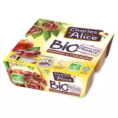 Apfelpüree 82,9 %, Ardèche-Kastanienzubereitung mit Vanille 17 % (Zucker“, Kastanien* 5,9 %, Wasser, Vanilleextrakt* 0,017 %), Antioxidationsmittel: Ascorbinsäure. Aus biologischem Anbau. Lass uns unser Herz finden