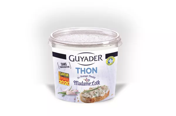 _Thon_ (44,5%), fromage au _lait_ pasteurisé Boursin Poivre (35%) (_lait_ et _crème_ pasteurisés, ferments _lactiques_, poivre (1,5%), sel, conservateur : E202), _lait_, _fromage_ blanc (_lait_, _crème_, ferments _lactiques_, enzyme coagulant microbienne), purée de citron et sirop de sucre inverti, protéines de _lait_, épaississant : gomme xanthane, ciboulette.