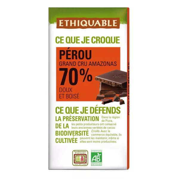 Pâte de cacao°* du Pérou 65%, sucre de canne°*, beurre de cacao°*. Cacao: 70% minimum dans le chocolat.