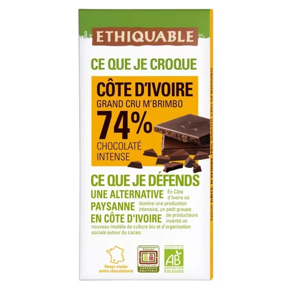 pâte de cacao°* de Côte d'Ivoire 67%, sucre de canne°*, beurre de cacao°*. Cacao: 74% minimum dans le chocolat. °issus de l'agriculture biologique *issus du commerce équitable (100% du poids total) Peut contenir des traces de fruits à coque, lait, gluten et sésame.