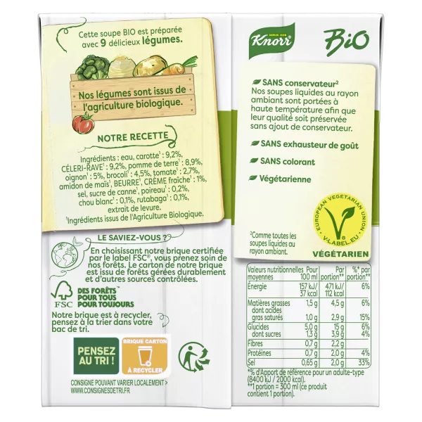 A NOSSA RECEITA Ingredientes água, cenoura1, 2 9,6%, AIPO-ROBIA1, 2 9,2%, batata1, 2 8,9%, cebola1, 2 5%, brócolis1, 2 4,5%, tomate1, 2 2,7%, amido de milho1, CREME1 1%, sal, MANTEIGA1, cana-de-açúcar1, alho-poró1, 2 0,2%, repolho branco1, 2 0,1%, rutabaga1, 2 0,1%. Pode conter cereais contendo glúten, mostarda, ovo, soja. 1Ingredientes da Agricultura Biológica. 2Verduras da Agricultura Sustentável. 40,3% vegetais1,2 (incluindo batatas).