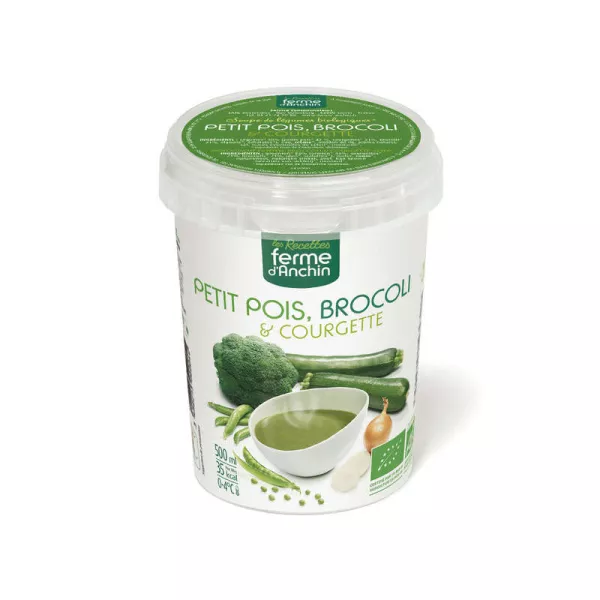 Legumes 50% (ervilha 43%, abobrinha 21%, brócolis 21%, cebola, cebolinha), água, creme de leite, amido de arroz, sabor natural, sal.