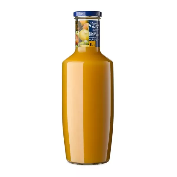 Purée de pêche, purée de pommes, purée de poires, purée de bananes, jus de raisins, d'oranges et d'ananas à base de concentré en proportion variable, eau, sucre, des arômes,acidifiant : acide citrique.