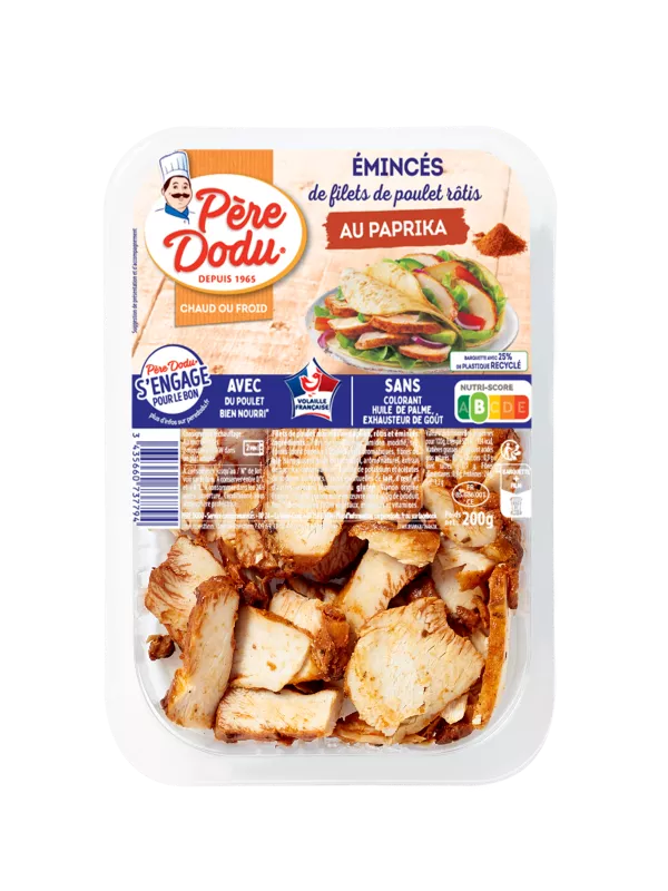 Filé de frango, água, amido modificado, sal, dextrose, especiarias (incluindo páprica 1,2%), plantas aromáticas, fibras de trigo (sem glúten), óleo de girassol, extrato de páprica, conservantes: lactato de potássio, acetato de sódio e citrato de sódio, antioxidantes: ácido ascórbico e eritorbato de sódio, fermentos. Carne de frango da França. 101g de carne usada para 100g de produto acabado.