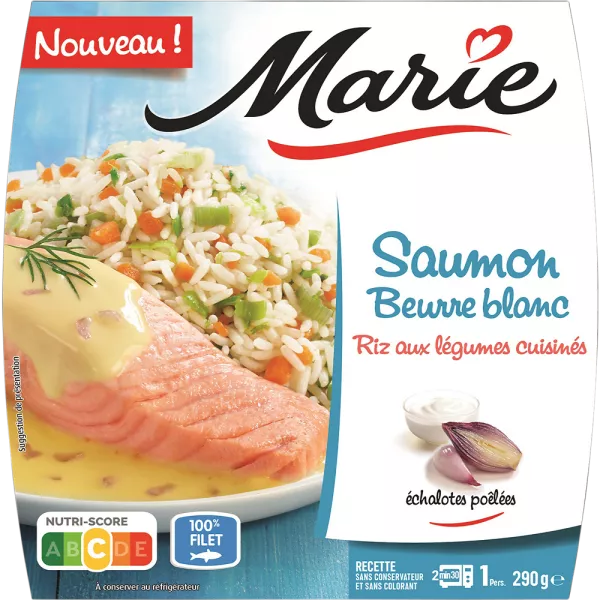 Arroz cozido 28,9% (água, arroz), salmão pré-cozido 23,8%, água, cenoura 8,6%, alho francês frito 7,3% (alho francês, óleo de colza, sal), natas frescas 4,9%, manteiga 4,3%, frito chalotas 4% (chalotas, óleo de colza, sal), vinagre de xerez, chalotas 1,6%, farinha de trigo, salsa 0,3%, sal, curcuma, malagueta.