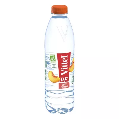 eau minérale naturelle VITTEL 90%, eau, sucre de canne liquide* 2,5%, acidifiant: acide citrique, arôme naturel de pêche avec autres aròmes naturels. *Issu de l'agriculture biologique.