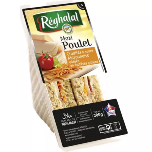 Volkorenbrood 51,2% (volkorenmeel, water, koolzaadolie, tarwegluten, suiker, zout, dextrose, gist, tarwemeel, emulgator: E471, meelverbeteraar: E300), 19,5% gezouten Halal kipfilets (15% Halal kip filet, water, soja-eiwit, zout, voedingszuur: E325, dextrose, natuurlijke aroma's, stabilisatoren: E450 en E451, verdikkingsmiddel: E407, antioxidant: E301), tomaten 9,7%, sla 4,8%, verse kaas met bieslook [kaas (magere melk , karnemelk, room, gedehydrateerde karnemelk, melkeiwitten, melkzuurfermenten), zout, gedehydrateerde bieslook], magere mayonaise 4% [water, koolzaadolie, alcoholazijn, eigeel, verwerkt maïszetmeel, suiker, Dijon-mosterd (water, mosterdzaad, alcoholazijn, zout, antioxidant: kaliumdisulfiet, zuurteregelaar: E330), zout, gereconstitueerde magere melk, zuurteregelaar: E330, verdikkingsmiddel: E415, conserveermiddel: E202], dikke lichte room (melkroom, melk, melkfermenten, texturizers : getransformeerd maïszetmeel, pectine), wortelen 2,4 %.