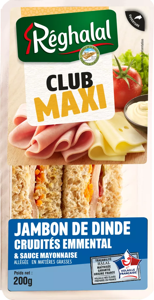 Volkorenbrood 52,5% (volkorenmeel, water, koolzaadolie, tarwegluten, suiker, zout, dextrose, gist, tarwemeel, emulgator: E471, meelverbeteraar: E300), Halal gekookte kalkoenham 17,5% (rood kalkoenvlees zonder vel , water, maïszetmeel, antioxidanten: E325 en E301, zout, dextrose, tarwe-eiwitten, aroma's, stabilisatoren: E450 en E451, verdikkingsmiddel: E407, conserveermiddel: E250), magere mayonaise (water, koolzaadolie, azijn, ei dooier, verwerkt maïszetmeel, suiker, Dijon-mosterd (water, mosterdzaad, alcoholazijn, zout, antioxidant: kaliumdisulfiet, zuurteregelaar: E330), zout, gereconstitueerde magere melk, zuurteregelaar: E330, verdikkingsmiddel: E415, conserveermiddel: E202], Emmentaler 7,5%, tomaten 5%, sla 5%.