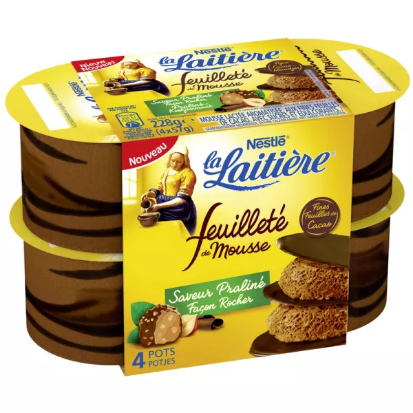 Mousse sữa hương praline (91,2%) và lá cacao mịn (8,8%): Sữa nguyên chất (60,3%), đường, kem (sữa), bơ cacao, cacao mass, sữa bột gầy, sôcôla đen 2,7% [khối lượng cacao, đường, chất nhũ hóa (lecithin hướng dương), hương vani tự nhiên], bột ca cao nạc, caramen (đường, nước, xi-rô glucose, chất điều chỉnh độ axit: natri hydroxit), bột ca cao, lactose (sữa), gelatin bò, chất nhũ hóa (E471), hương liệu , muối, chất tạo ngọt (sucralose, acesulfame K).