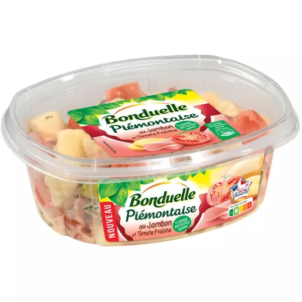 Khoai tây tiệt trùng (46%), cà chua (17%), giăm bông nấu chín cao cấp (11%) (giăm bông heo (10%), muối, nước dùng (xương heo và thịt heo), hương liệu mặn (chứa polyphenol tự nhiên), chất chống oxy hóa: ascorbic axit), dầu cobza, trứng luộc chín (5,5%), nước, giấm rượu, dưa chua thái lát trong giấm (1%) (dưa chua, nước, giấm rượu, muối, canxi clorua), mù tạt Dijon (nước, mù tạt hạt giống, giấm rượu, muối), muối, rau mùi tây lá dẹt, lòng đỏ trứng bột tiệt trùng, chất làm đặc: xanthan gum - guar gum, hương tiêu tự nhiên.