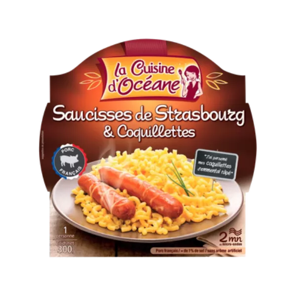Coquillettes précuites 34% (semoule de blé dur, eau, blanc d'oeuf, huile de colza), eau, saucisses de Strasbourg 23% (viande de porc (origine France), eau, gras de porc, plasma de porc, sel, dextrose, épices et plantes aromatiques, arômes naturels, colorant : extrait de paprika, antioxydant : acide ascorbique, conservateur : nitrite de sodium), emmental 6,6%, farine de blé, crème fraîche 1 %, beurre demi-sel, moutarde de Dijon (eau, graines de moutarde, vinaigre d'alcool, sel, acidifiant : acide citrique, conservateur : disulfite de potassium), laiten poudre, ciboulette 0,2%, bouillon de volaille (sel, arômes naturels, graisse de poule, extrait de levure, épices et aromates), sel, arôme naturel (contient lait), épaississant : gomme xanthane, poivre, muscade.